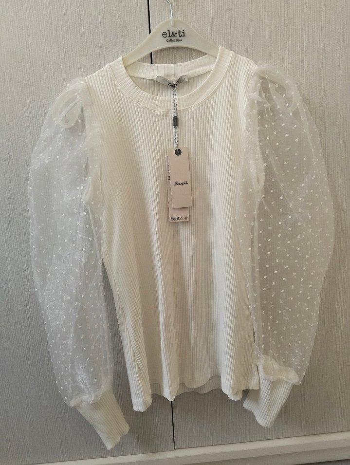Beyaz, tül detaylı uzun kollu kadın bluz, yuvarlak yaka ve pamuklu dokusuyla rahat bir kullanım sunar. Elati markasına ait.
