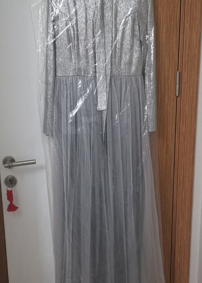 Parlak gri kabarık tül elbise 38 40 beden Kat kat tül detaylı abiye Tüllerinin ucunda ufak tefek deformeler var ama görünmüyor göze batmıyor
