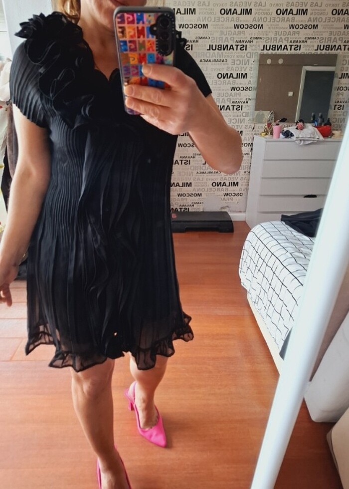 Etiketini kesmişim hatırlayamadım elbise gibi yada tunik gibi hatta pareo olarak kullanılabilir çok şık esnek pleli gibi yaka detayı şahane durıyor iki kol arası 50 bel 51 basen 57 boy 81 cm şahane marka temsili elbise
