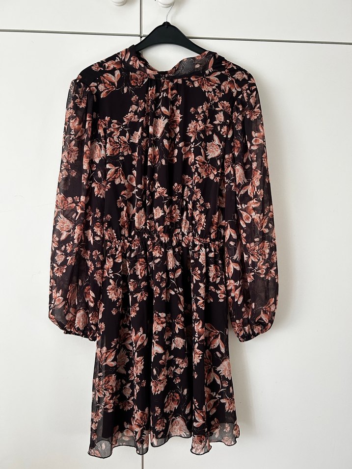 Uzun kollu, yüksek yakalı ve fırfırlı detaylara sahip bol kesim midi elbise. Koyu kahverengi. Hiçbir kusuru yoktur.