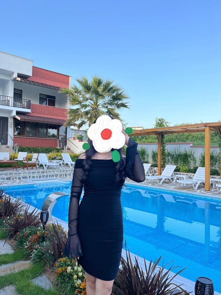Dar kesim siyah midi elbise, likralı, uzun tül kollar, parti stiline uygun. bir kez giyildi m beden