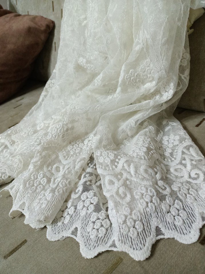 birinci sınıf tül kumaşa,çok zarif bir desene sahip harika bir BRİLANT ÜRÜNÜ.hiçbir deformesi yok.bir kenarından ölçüye göre kesildi.bir kenarı boydan dikişsizdir.ter temiz yıkanıp kaldırıldı hemen takıp kullanıma hazır halde.EN 105 CM BOY 1.75 CM