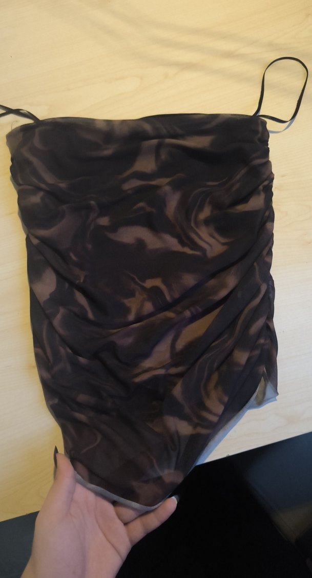 Drapeli, siyah kahverengi bağlamalı desenli crop tül kumaştan, midi boyda ve esnek Outdoor kullanıma uygun.