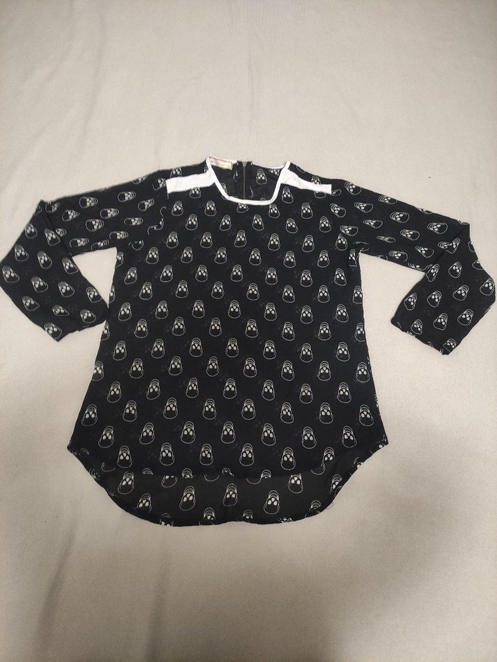 Siyah renkli ve uzun kollu kadın bluz, yuvarlak yakalıdır. Gevşek kesim ve düğmeli detaylara sahip, sentetik kumaştan üretilmiştir.