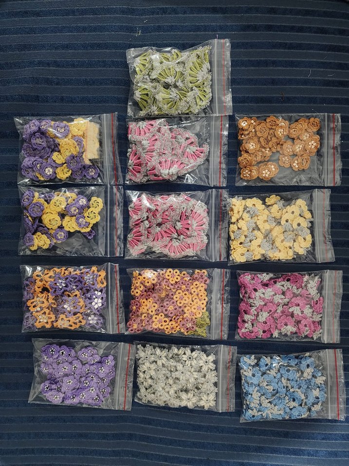 Çeşitli renklere sahip, şeffaf poşetlerde paketlenmiş renkli nakışlı çiçekli tülbentlik oya seti. 15 tülbentlik oya mevcut. Görselde 13 paket görünüyor fakat iki pakette 80 tane oya var. El emeği göz nuru. Alan güle güle kullanır inşallah.