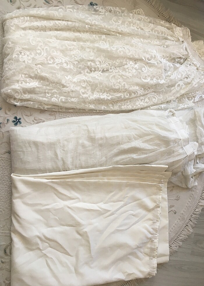 Ikı tane büyük ebat tül perde. Desenli olanlar ufak yırtıklar var. Düz tülde büyük yırtık ve dikim hataları var sorabilirsiniz detayını. Ve güneşlik var sıfır ayarında dır