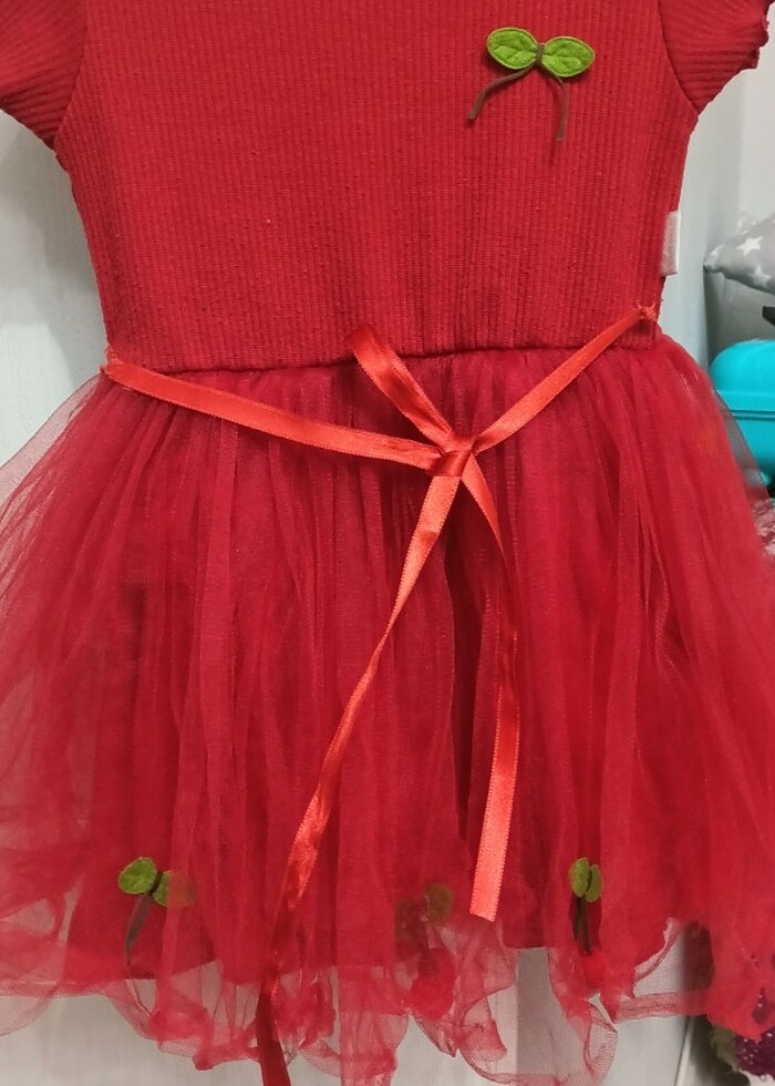 Kırmızı tüllü elbise kiraz süsleri vardı bazıları düştü fotoğraf ta belli
