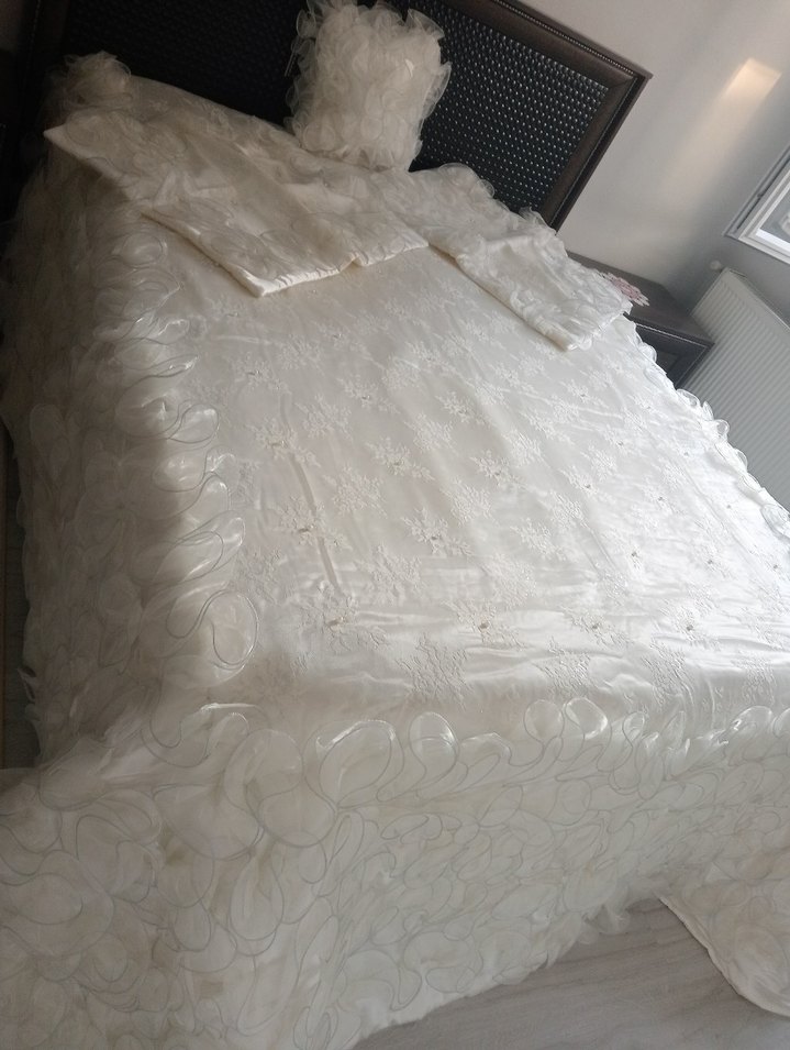 tüllü İnci detaylara sahip parlak beyaz yatak örtüsü, şık desenleriyle dikkat çeker. Aynı kumaştan yastık kılıfları da dahildir. ️1 kere serildi yeni