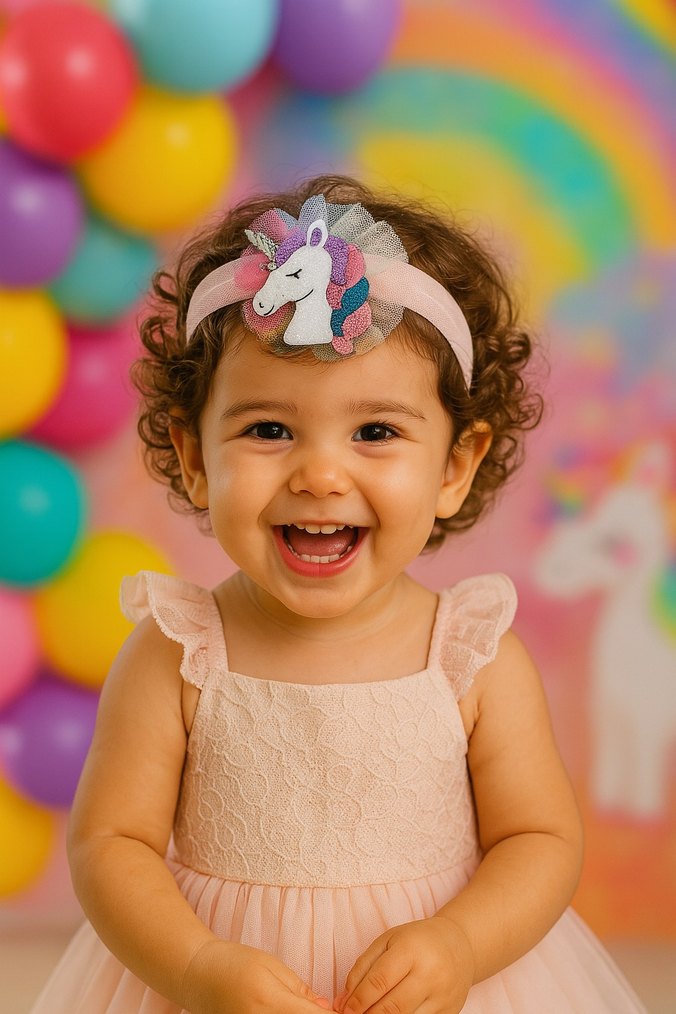 Pembe pastel renkte, fırfırlı ve tie-dye desenli unicorn detaylı çocuk saç bandı, bohem ve retro tarz için uygun.