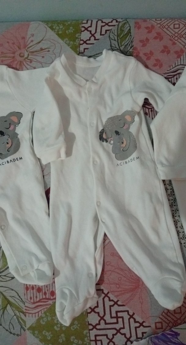 Uzun kollu, baskılı koala desenli beyaz, vücuda oturan emzirme pijaması. Midi boy ve gri detaylara sahip. hıc gıyılmedı tertemız 0 3 ay