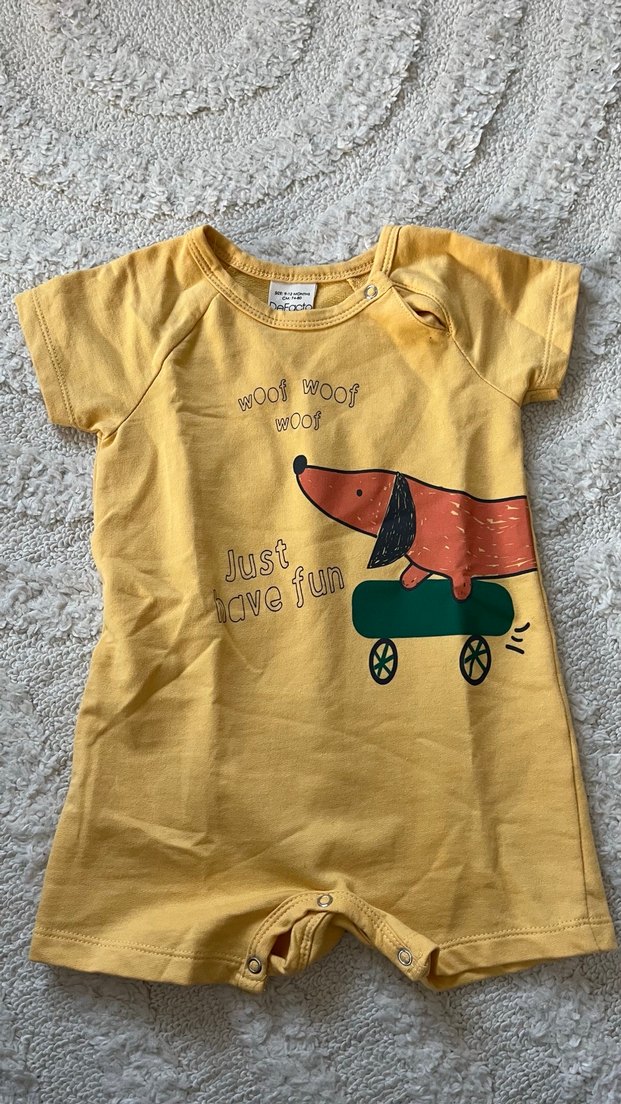 Sarı pamuklu kısa kollu erkek bebek tulumu, yuvarlak yaka ve renkli baskıya sahip. Velcro kapanışlıdır. Üzerinde 'Just have fun' yazısı bulunur . 9-12 ay biz mevsimine denk gelmediğimiz için hiç kullanmadık tertemiz