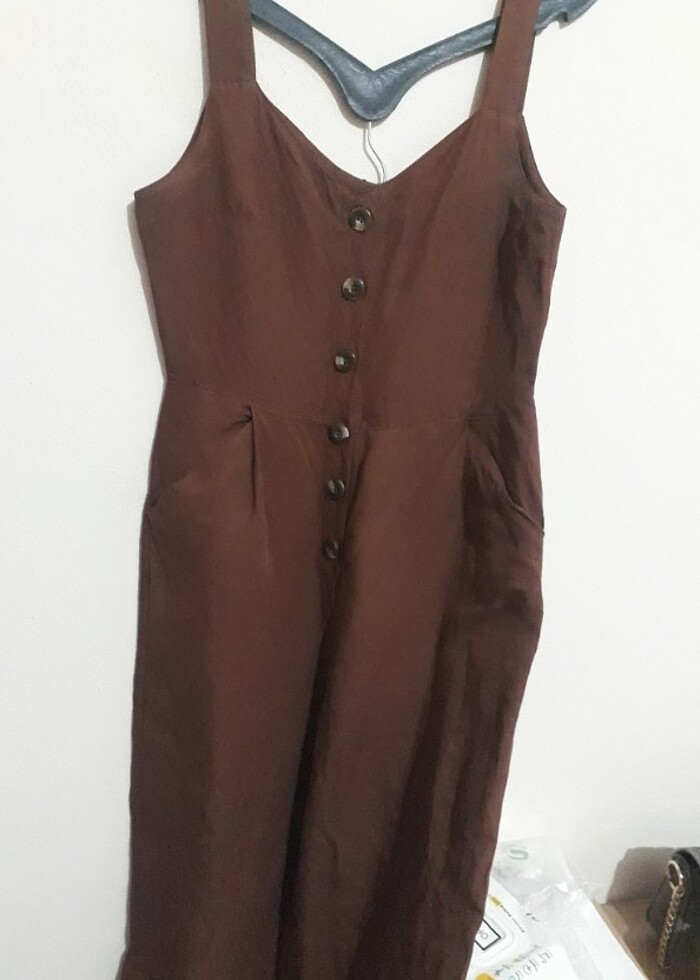 Kahverengi keten tulum. Sadece 1 kere kullanıldı, hicbir deformesi yoktur yalnızca koltukaltında az deodorant izi vardır leke çıkarıcı ile çıkacaktır , dar geldiği için satıyorum. Depdorant izi vardır. Ikı koltuk altı arası ölçüsü 45cm, omuzdan boyu 145cm dir. Rahat bir üründür.