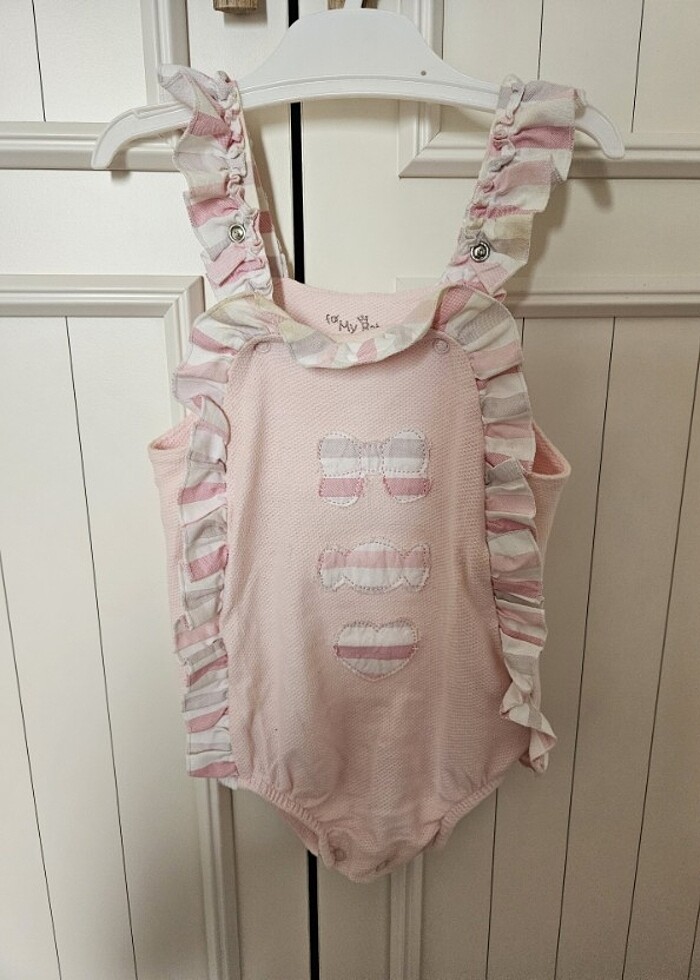 Yazlık tulum. Şeker gibi görünüyor, uzatma askısı mevcut. 9-18 ay arası giyilebilir. Tertemiz