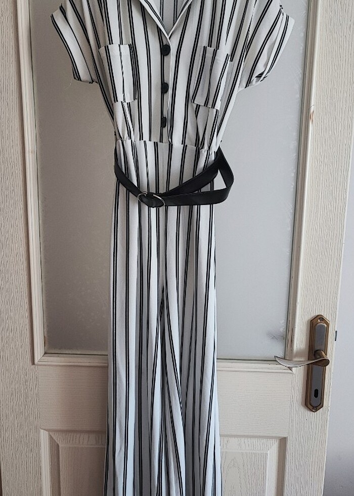 Siyah beyaz çizgili tulum bir defa giydim bedeni olmuyor