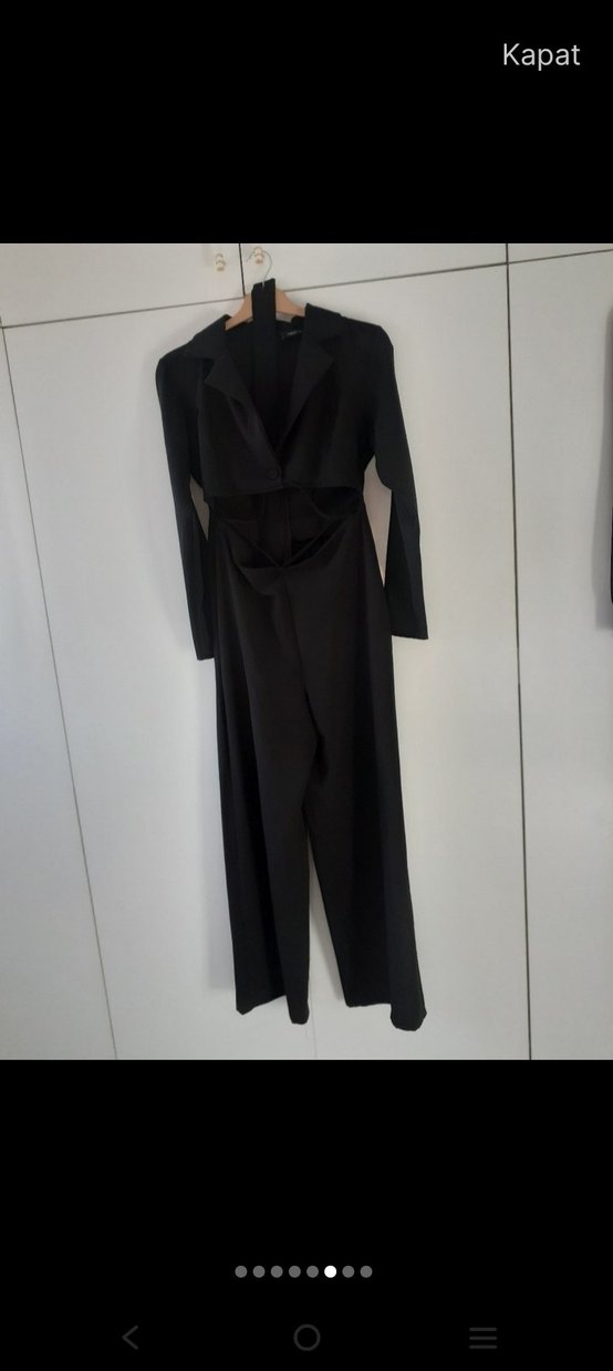 Siyah uzun tulum, kemerli ve notch yakalıdır. Sentetik kumaştan, regular fit ve askılı kolludur. İş ortamına ve avangart tarza uygundur.