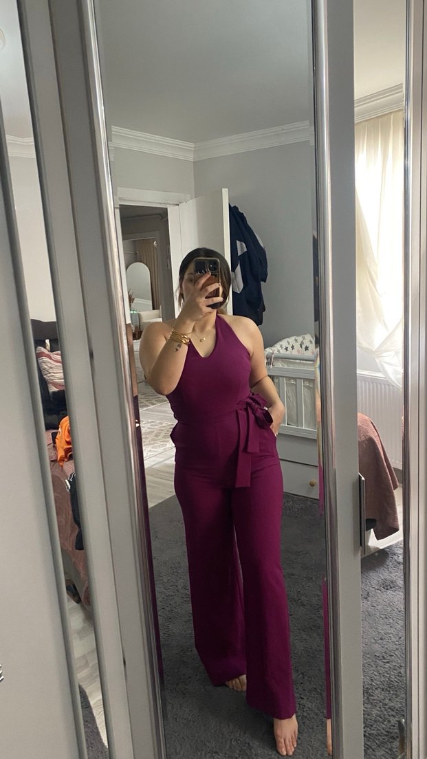 Mor renkli, saten kumaştan yapılmış, halter yaka ve askılı kollu, bele oturan midi uzunlukta kemerli tulum. Romantik akşamlar için uygundur.