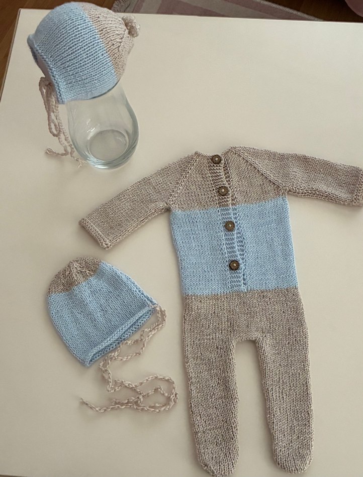 Gri renkte, uzun kollu ve bohem tarzda örme erkek bebek tulumu. İkili bağcıklı örme şapkalarla tamamlanmıştır. İki şapkalı vardır