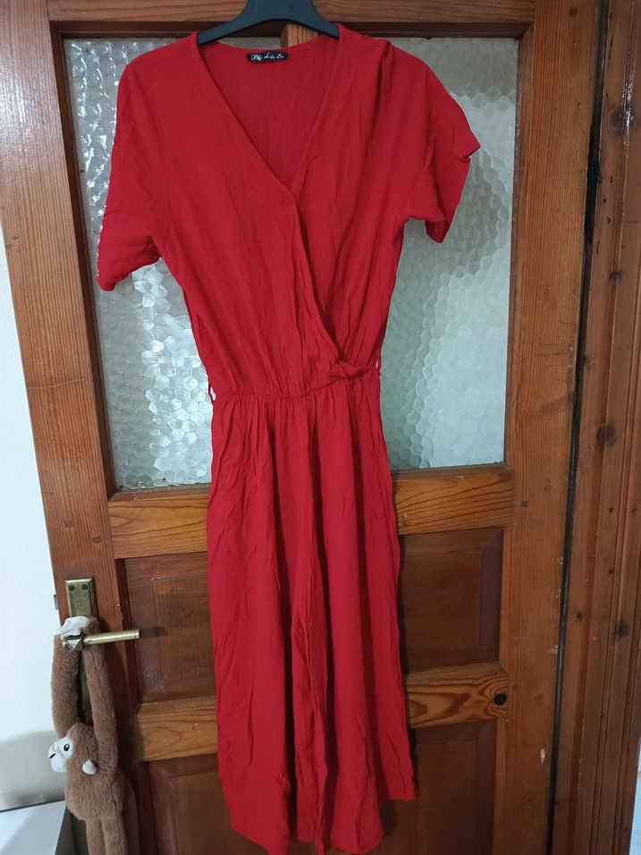 Keten kumaştan, kısa kollu, V yakalı ve salaş kesim kırmızı uzun elbise, drapeli detaylara sahip, minimalist ve bohem tarzda. ✨