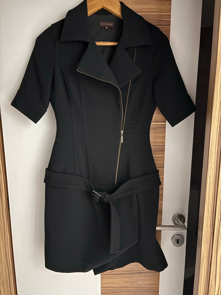 Kemerli, kısa boy, siyah deri kadın tulum elbise. Kısa kollu, kesimli ve modern ofis tarzına uygun.boy 88-89 en 36/37