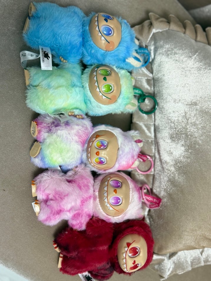 Canlı renklerde kürklü, ifadeli yüzlere sahip peluş oyuncak seti. Her biri anahtarlık aparatıyla kolay taşınabilir.