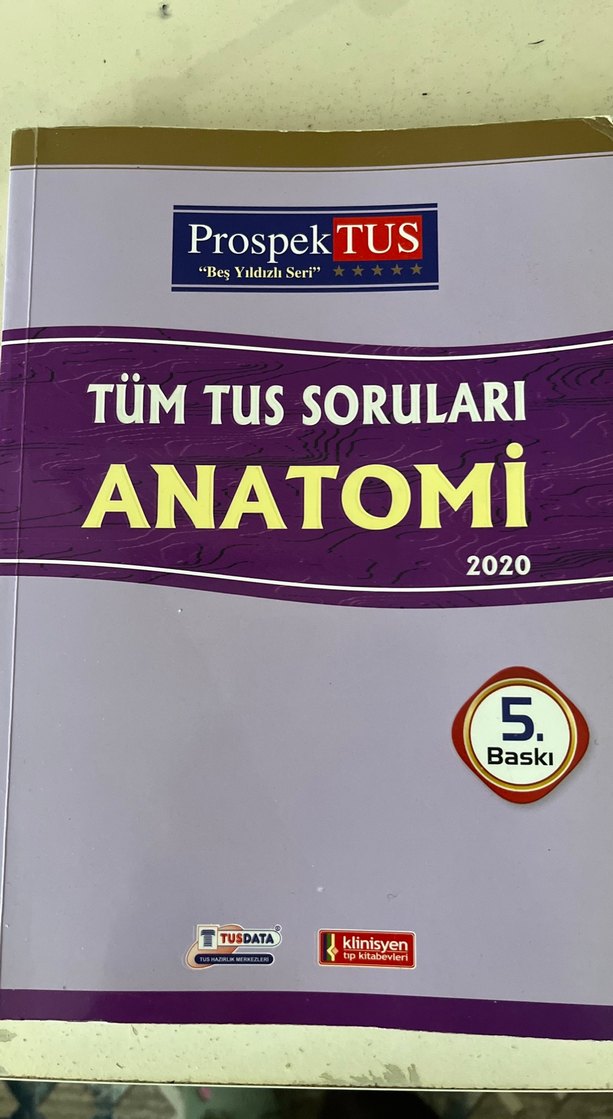 2020 tarihli ProspekTUS'un Beş Yıldızlı Serisi'nden Tüm TUS Soruları Anatomi kitabı, anatomi konusundaki soruları içerir. 5. baskıdır. Kitabın büyük kısmı boş. Bazı yerlerin altı çizili ve ufak notlar alınmış. Sorular görseldeki gibi işaretli değil.