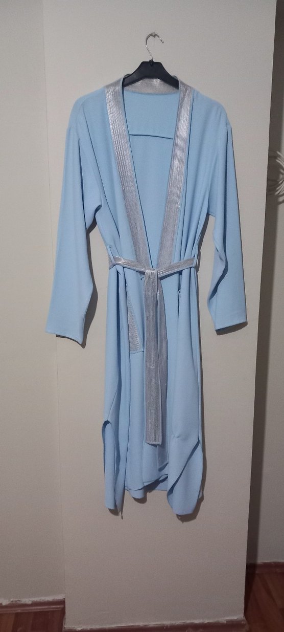 Uzun, pastel mavi renkte kadın tunik, regular kesim ve askılı kollara sahip. Minimalist ve çağdaş tarzda, desensiz ve kemerli.Cebinde birinde küçük bir ip kaçağı var.Etiketi yok,hiç giyilmedi.