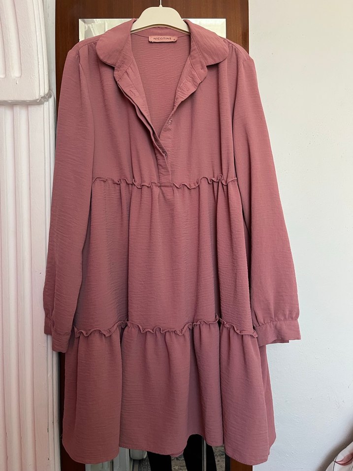 Yumuşak keten kumaştan, uzun kollu, yakalı ve bol kesim pembe tunik. Fırfır detaylı, midi boy ve günlük kullanıma uygun.