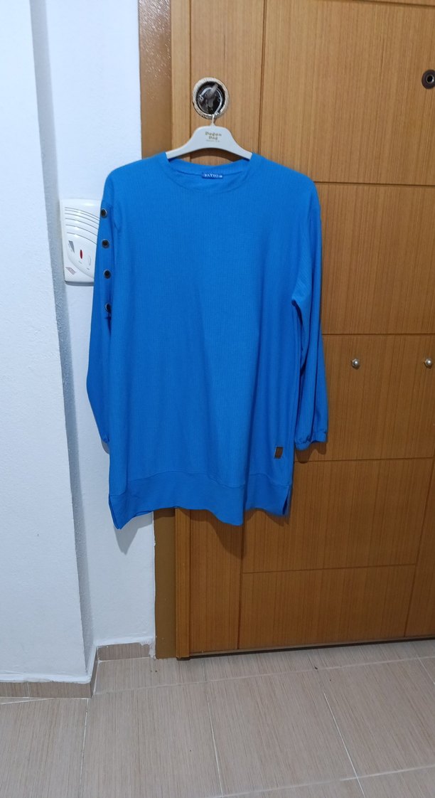 Mavi renk, düğmeli uzun kollu, bisiklet yaka ve normal boyda, rahat kesim kadın tunik Yumuşak ve sıcak kumaştan, günlük sokak stili için uygun.