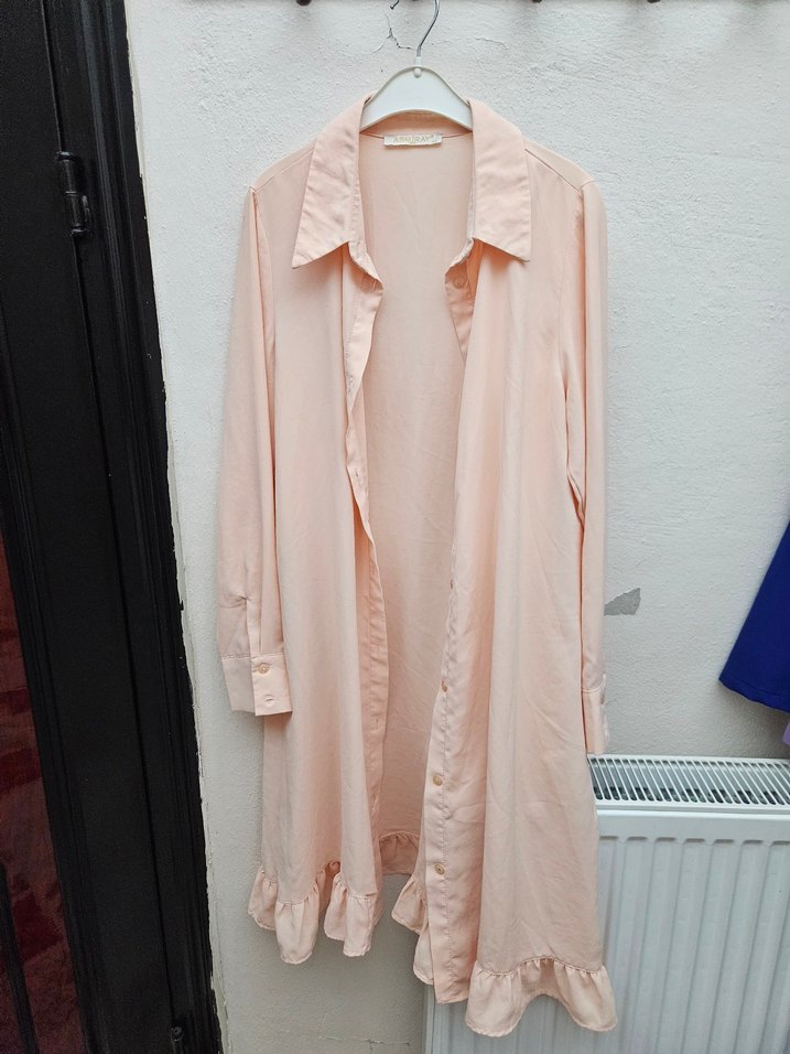 Pembe renk, keten kumaştan, uzun kollu ve bol kesim . Yaka kısmı kesik ve etek ucu fırfırlıdır, rahat ve şık bir görünüm sunar. temiz
