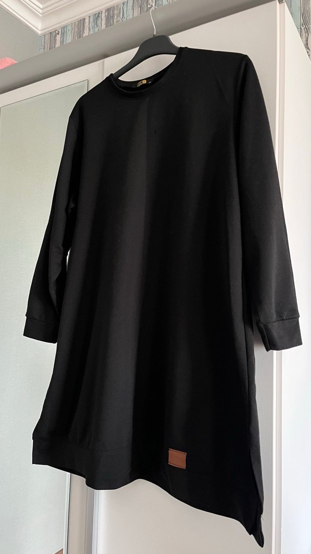 Siyah renkte, uzun kollu ve salaş kesime sahip kadın tunik. Yuvarlak yaka ve dökümlü tasarıma sahip, sentetik kumaştan üretilmiştir. Minimalist stil, günlük kullanım için uygun.