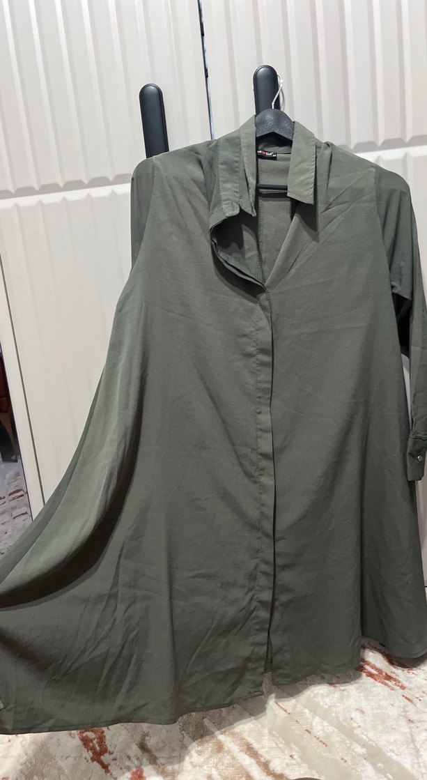 Uzun boylu, düğmeli ve yakalı bu kadın keten tunik, bol kesimiyle rahat bir kullanım sunar. Gri-khaki renkte, günlük ve sokak stili için uygundur.