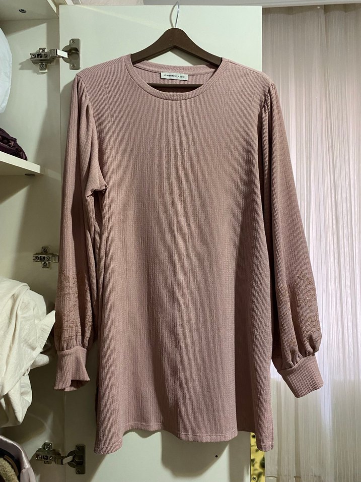 Yumuşak örme keten kumaştan, nakış detaylı, uzun kollu ve normal boyda bej kadın tunik. Salaş kesimi ve yuvarlak yaka tasarımı ile günlük kullanıma uygundur. Hiç giyilmedi etiketsiz. Rengi fotoğrafta farklı çıkıyor. Pudra pembesi hoş bir rengi var.