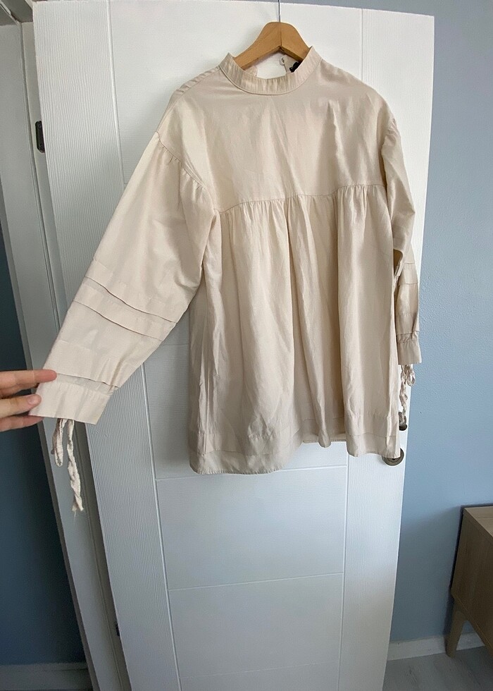 Çok fazla giyilmedi çok rahat tam yazlık hafif iç gösteriyor ama uygun çamaşırla sorun olmuyor kol ucunda hafif leke var Göğüs ölçüsü:51 cm boy:83 cm