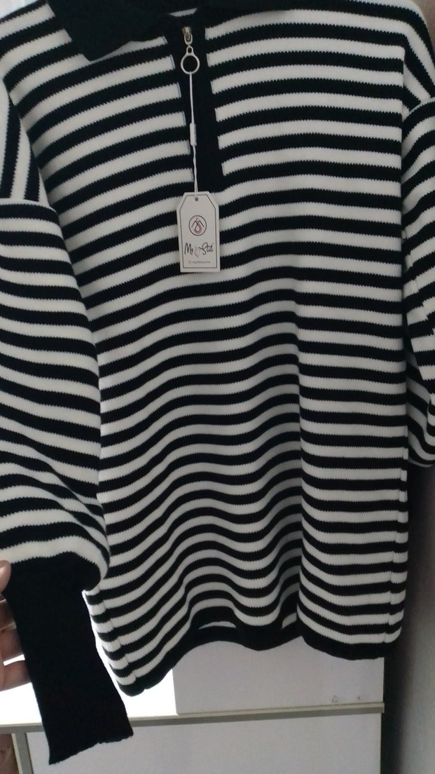 Pamuk kumaştan, çizgili ve dar kesim uzun kollu kadın kazak. Bisiklet yaka ve yan yırtmaç detayları bulunur. Günlük sokak stili için uygundur. standart beden ölçü verebilirim