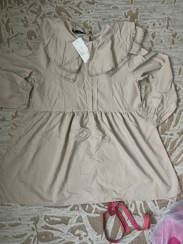 Bej renkte, keten kumaştan yapılmış, bol kesim kız çocuk bluzu. Uzun kollu, yakalı ve fırfır detaylı, bohem tarzda