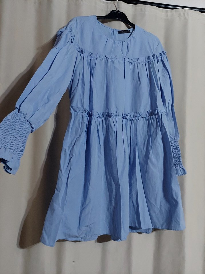 Mavi keten mini elbise, bol kesim uzun kollu ve robalı detaylara sahip, minimalist bohem tarzında ve yuvarlak yakalıdır. hiç kullanılmadı