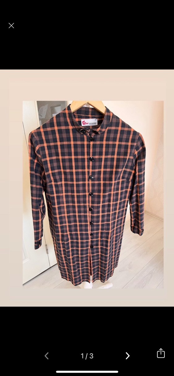 Düğmeli, uzun kollu, kareli desenli midi boy kadın gömlek. Kahverengi ve koyu renklerin kullanıldığı, normal kesim ve yakalı yapıya sahiptir. Günlük sokak stili için uygundur.