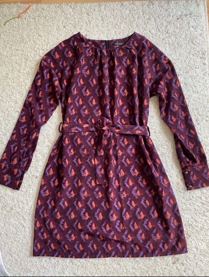 Bordo renkli, bağcıklı midi elbise, bol kesim ve uzun kollu. V yaka ve batik desenli, bohem tarzda, ofis için uygun.
