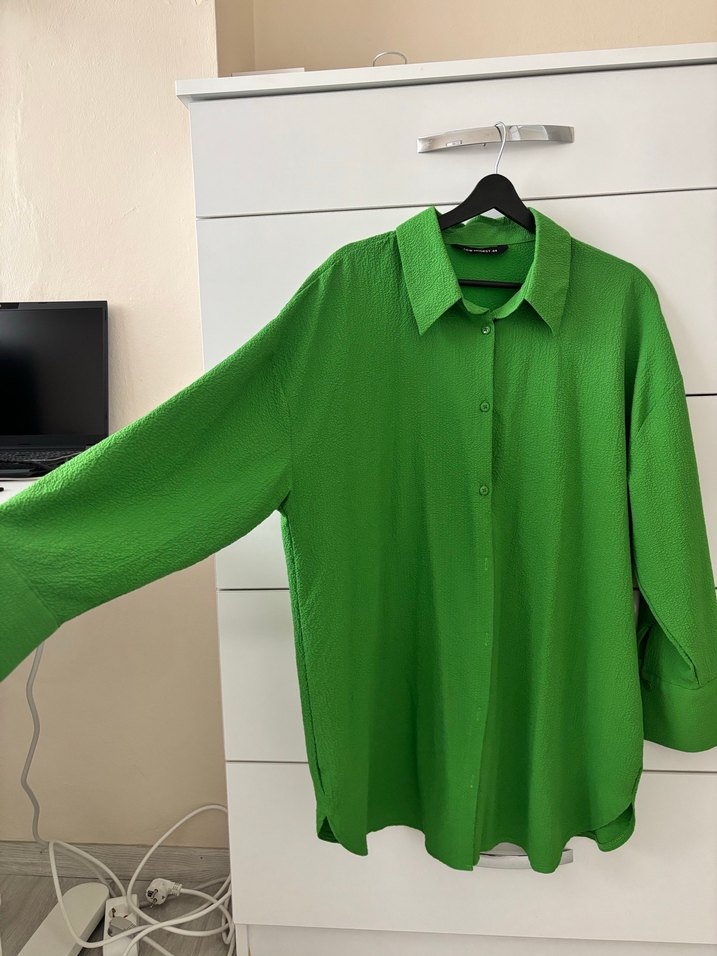 Parlak yeşil renkte, keten kumaştan yapılmış, uzun kollu, yakalı ve düğmeli ön yapıya sahip bol kesim midi uzunlukta gömlek.