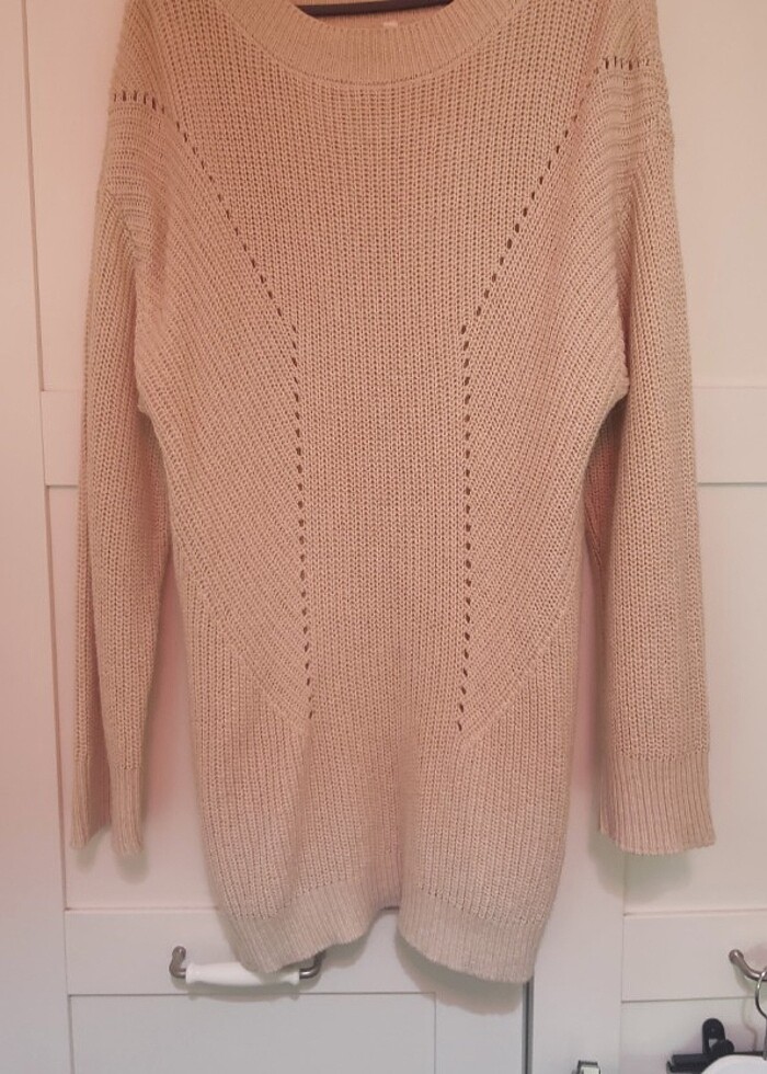 Krem rengi,yandan yırtmaçlı, bisiklet yaka,önden ajur detaylı tunik kazak,yargıcı marka boyu 71 cm.