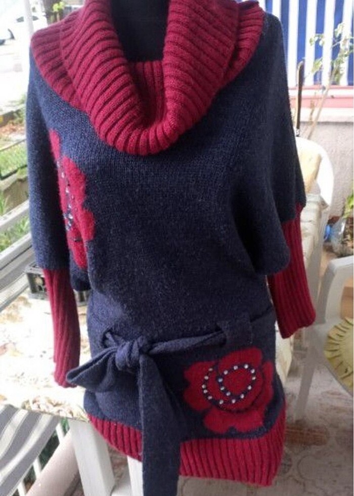 Geniş yaka boğazlı kemeri var tayt üstü veya mini elbise olabilir yünlü s ve m uyumlu esniyor