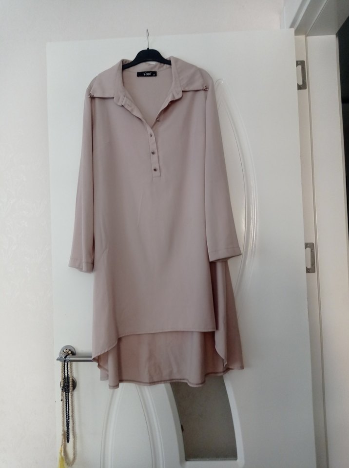 Kemerli, uzun kollu, tunik. Midi boyda, yumuşak sentetik kumaştan, yakasında minik leke gibi fotoda goruntuledm oyuzden fiyatı uygundur