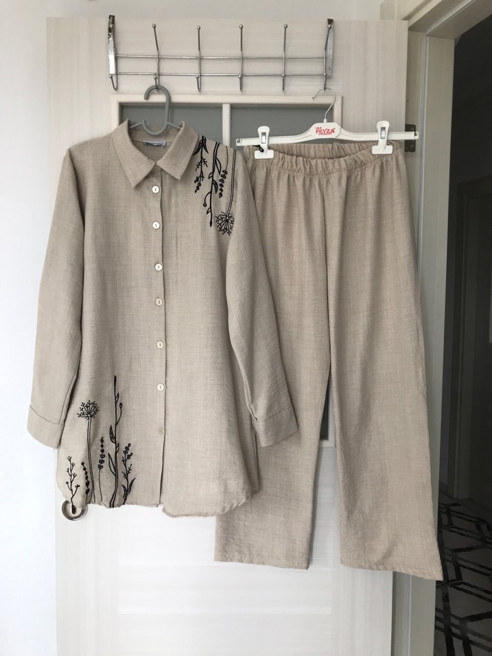 Tunik pantolon takım işleme detaylı bir sorunu yoktur bir iki kere giyildi iç göstermez tunik boy 80 cm iki kol arası 50 cm pantolon boy93 cm beli lastiklidir marka temsili