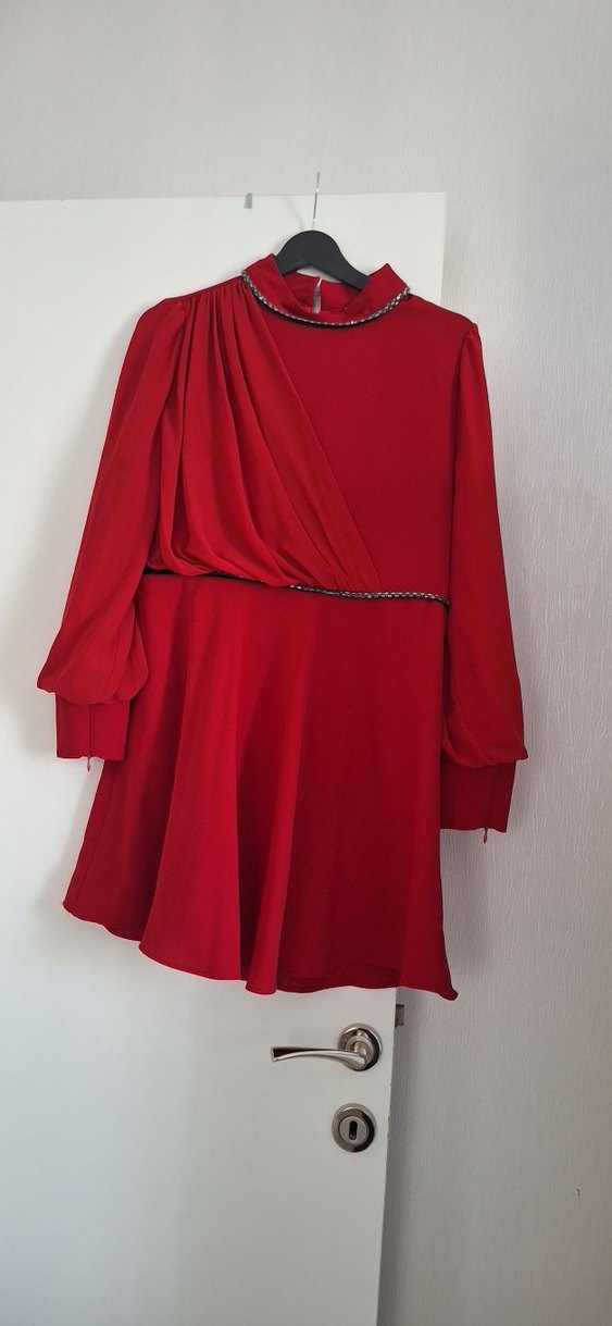 Parlak kırmızı renkte, tunik Pantolon takım hakim yakalı, uzun kolludur.Kol kısmında kisa gizli fermuarlıdir.Pantol beli yarim lastiklidir.