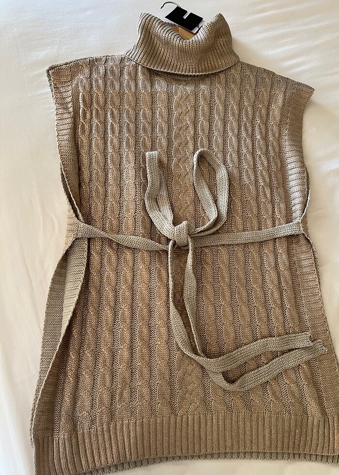 Ürün hiç kullanılmadı. Süveter tarzında yanları dikişsiz.Uzunluğu 70 cm.