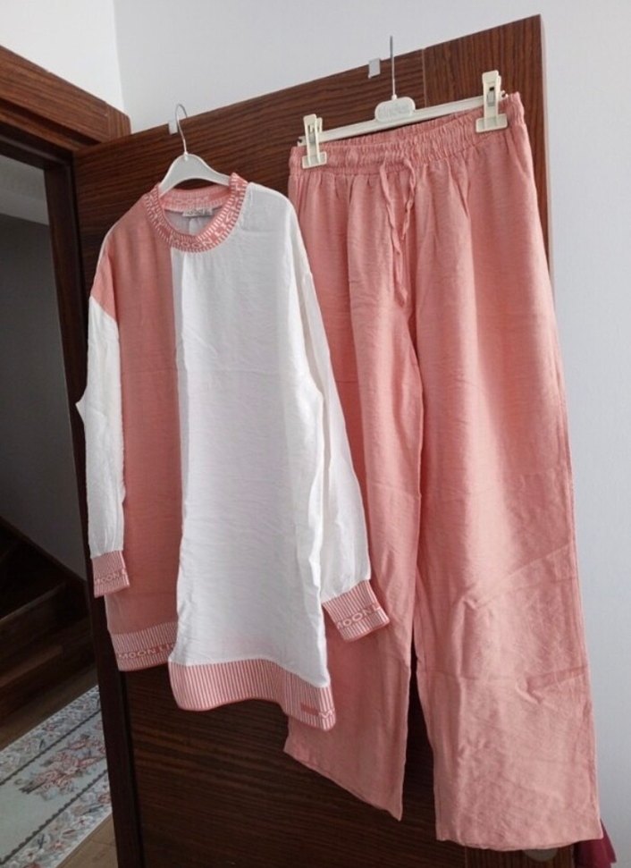 Pembe ve beyaz renklerde, uzun kollu ve geniş kesim rahat alt üst takım