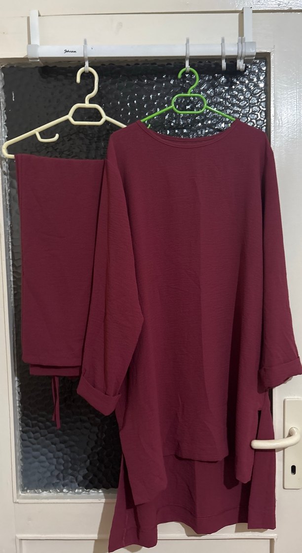 Renk fuşya Temiz kullanıldı Pantolon Boy: 96-97 cm Tunik En: 57 cm Tunik Ön Boy: 78 cm Tunik Arka Boy: 94 cm Beden yazmıyor ama geniş bir beden tahmini L bedendir