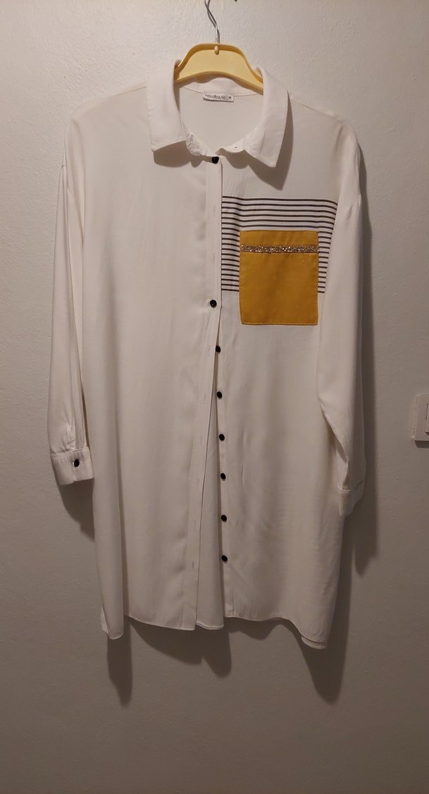 Uzun kollu, düğmeli, salaş kesim beyaz gömlek. gomlek yaka ve çizgili detaylı sarı cep bulunur. Yumuşak sentetik kumaştan, günlük kullanıma uygun. Yaz kış giyilir,spor veya iş için konbinlenir.defosuzdur.