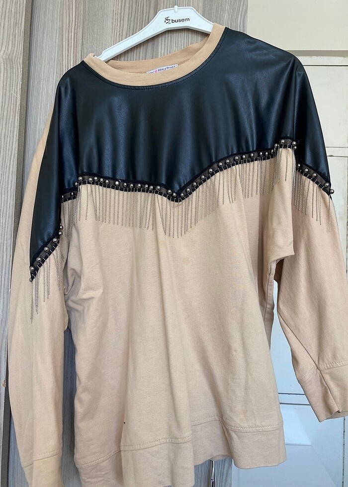 Üst ön kısmı deri zincir detaylı, yarasakol üst. S beden ama m. Ve L uyumlu olur yarasa kol olduğu için
