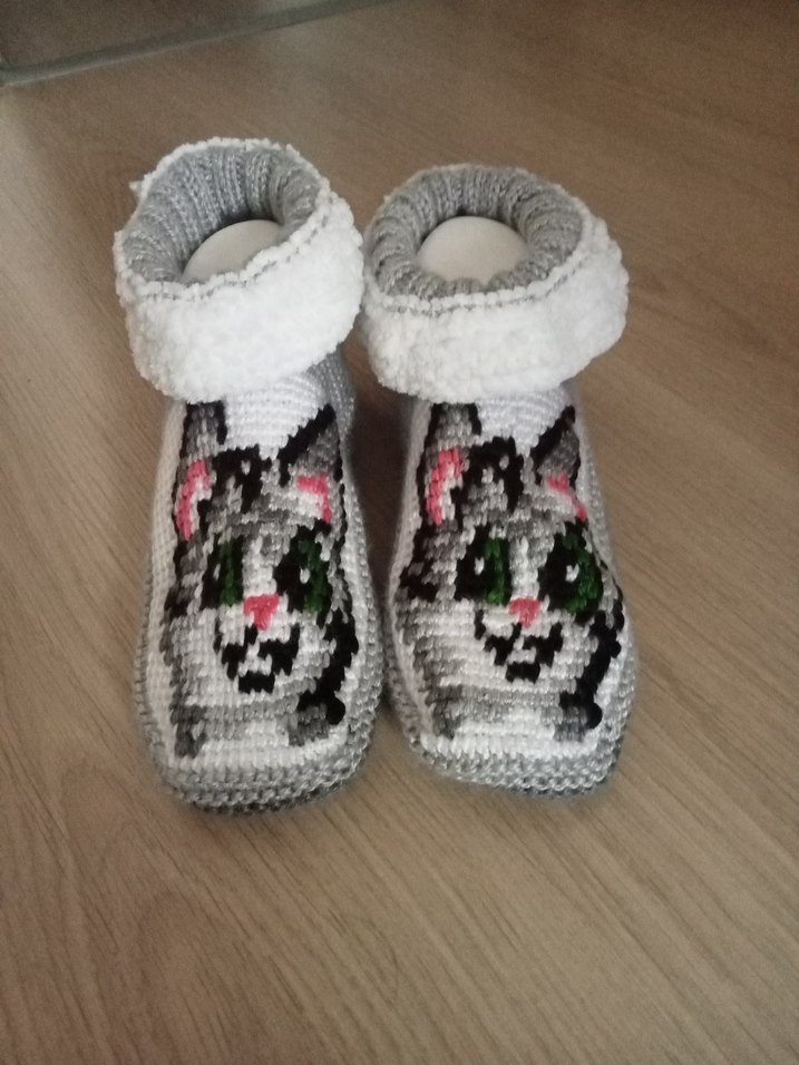 Gri örgü bayan bot parik nakışlı kedi desenleri ve yumuşak iç astarla sıcak tutar. Bohem tarzına uygun.